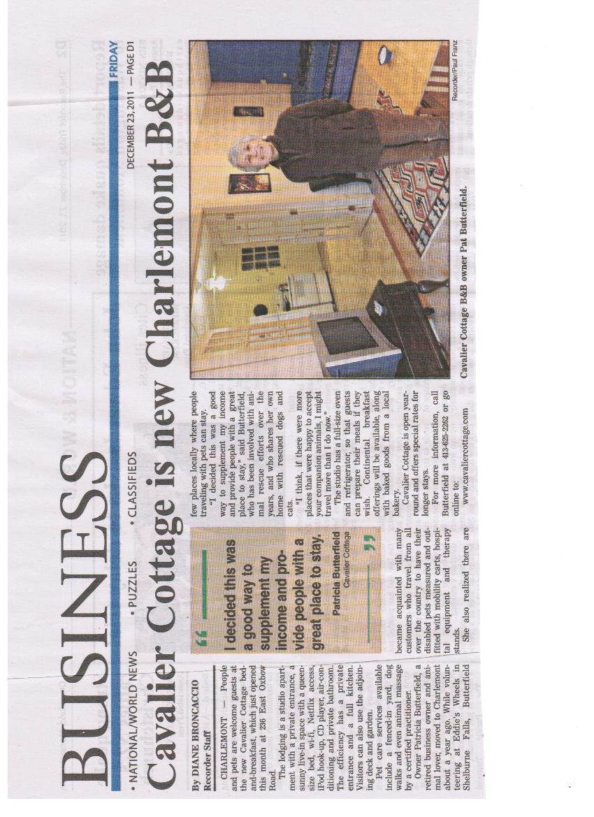 CAVALIER COTTAGE B&B ARTICLE IN THE GREENFIELD RECORDER Cavalier Cottage B&B makes the Greenfield Recorder. Cavalier Cottage B&B, pet friendly lodging near the Mohawk Trail in W.MA in the Greenfield Recorder By patricia|2012-02-27T15:56:26-05:00January 7, 2012|Uncategorized|Comments Off on CAVALIER COTTAGE B&B ARTICLE IN THE GREENFIELD RECORDER Share This Story, Choose Your Platform! FacebookXBlueskyRedditLinkedInWhatsAppTelegramTumblrXingEmailCopy Link About the Author: patricia Related Posts Cavaliers – A poem by Rebecca Taksel Cavaliers – A poem by Rebecca Taksel RESCUED PITTIES INDIGO & DIXIE BELLE VISIT THE COTTAGE RESCUED PITTIES INDIGO & DIXIE BELLE VISIT THE COTTAGE STAY/SKI/DINE DEAL AT VERY PET-FRIENDLY CAVALIER COTTAGE STAY/SKI/DINE DEAL AT VERY PET-FRIENDLY CAVALIER COTTAGE BEAUTIFUL CORGI WINNIE VISITS THE COTTAGE & EDDIE’S WHEELS BEAUTIFUL CORGI WINNIE VISITS THE COTTAGE & EDDIE’S WHEELS